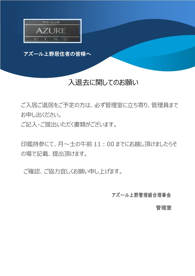 ご入居ご退居をご予定の方は、必ず管理室に立ち寄り、管理員までお申し出ください。 ご記入・ご提出いただく書類がございます。 印鑑持参にて、月~土の午前11:00までにお越し頂けましたらその場で記載、提出頂けます。